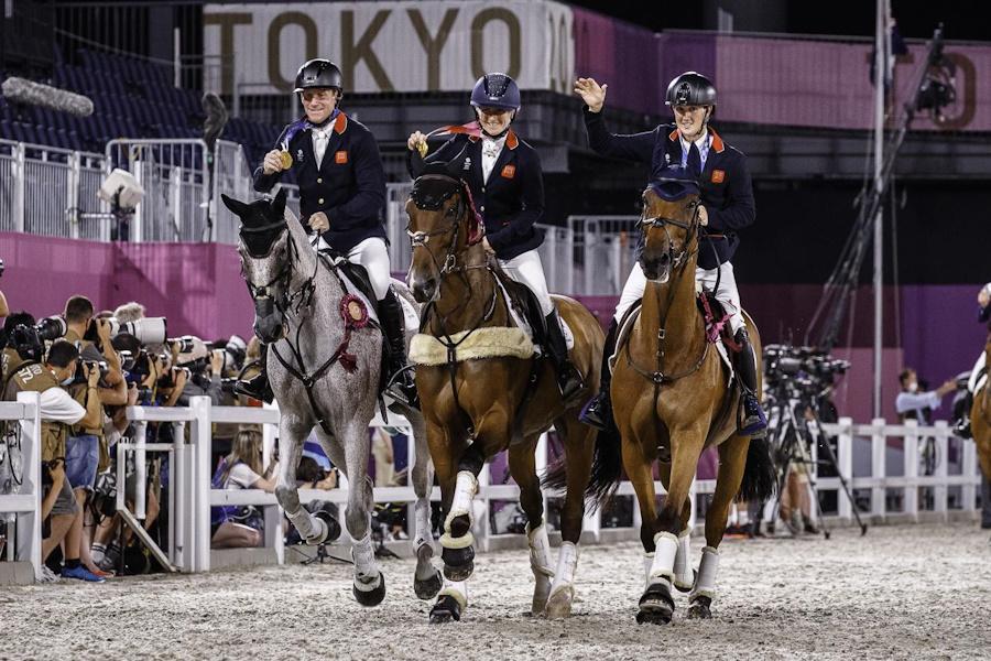 Oliver Townend & Ballaghmor Class; Laura Collett & London 52; Tom McEwen and Toledo de Kerser during the  Medal Ceremony for Eventing at the Tokyo 2020 Olympic Games. © FEI/Libby Law