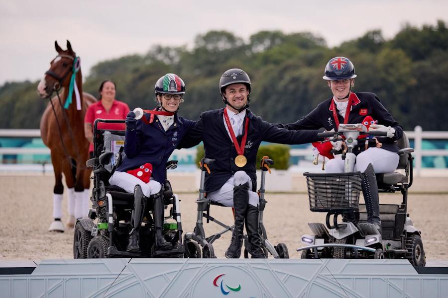 L-R: Sara Morganti (ITA), Rihards Snikus (LAT) and Mari Durward-Akhurst (GBR), Individual Freestyle Grade I Podium at the Paris 2024 Paralympic Games. © FEI/Liz Gregg
