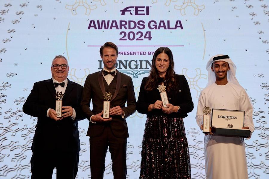 FEI Awards 2024 winners. (L-R) Richard Frankle from the Namibian Equestrian Federation (NAMEF), Christian Kukuk (GER), Bettina Cardinael (FRA) and Omar Abdul Aziz Al Marzooqi (UAE). FEI / Liz Gregg