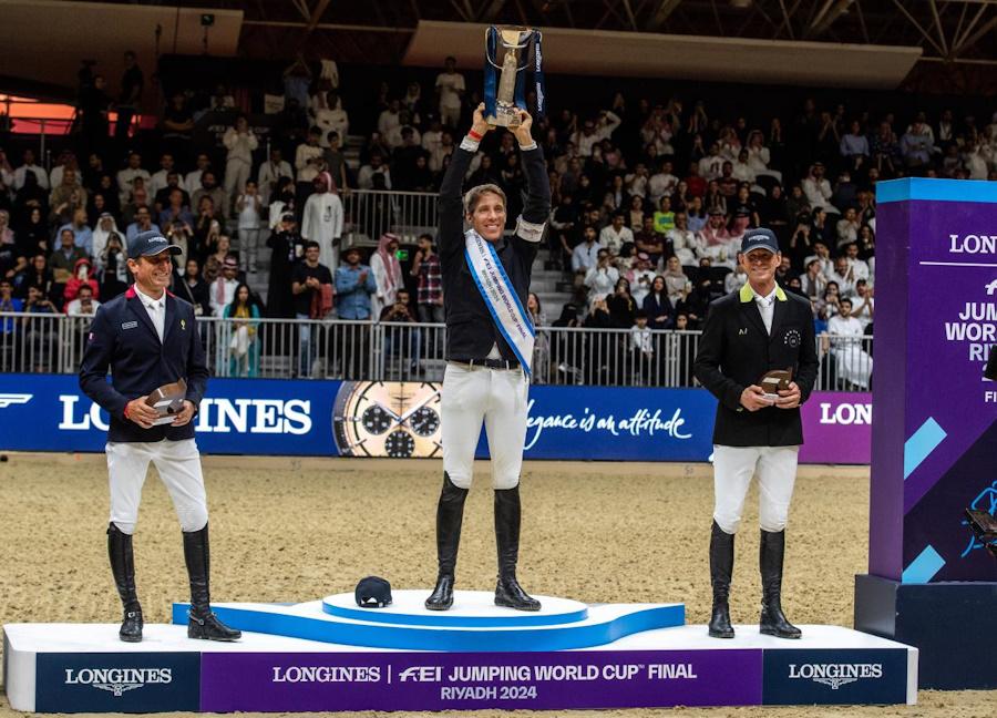Julien Epaillard (FRA), Henrik von Eckermann (SWE) and Peder Fredricson (SWE) on the podium of the FEI Jumping World Cup Final 2024 in Riyadh (KSA)